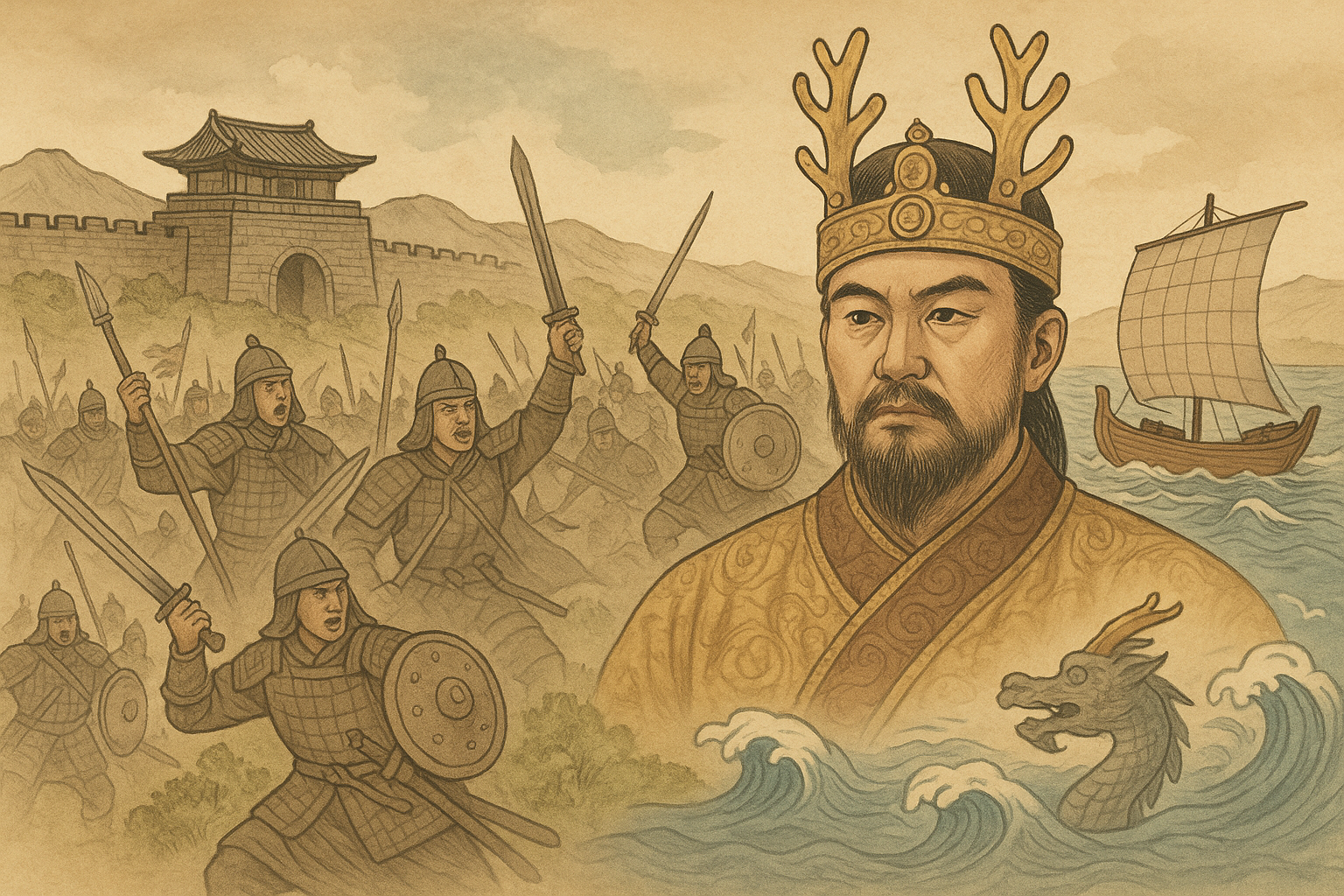 문무왕은 아버지 태종무열왕이 개척한 삼국통일의 길을 계승하면서도, 당나라와의 치열한 전쟁을 통해 자주적 통일을 완수한 인물이었습니다. 그는 유능한 장군들과 협력하며 나라의 기반을 다졌습니다. 또한 사후에는 자신을 바다의 용이 되어 나라를 지키겠다고 유언을 남기며, 동해의 대왕암에 안치되었습니다. 이는 단순한 전설이 아니라, 왕이 나라와 민족을 위해 끝까지 헌신하고자 한 의지를 보여주는 역사적 상징입니다.
