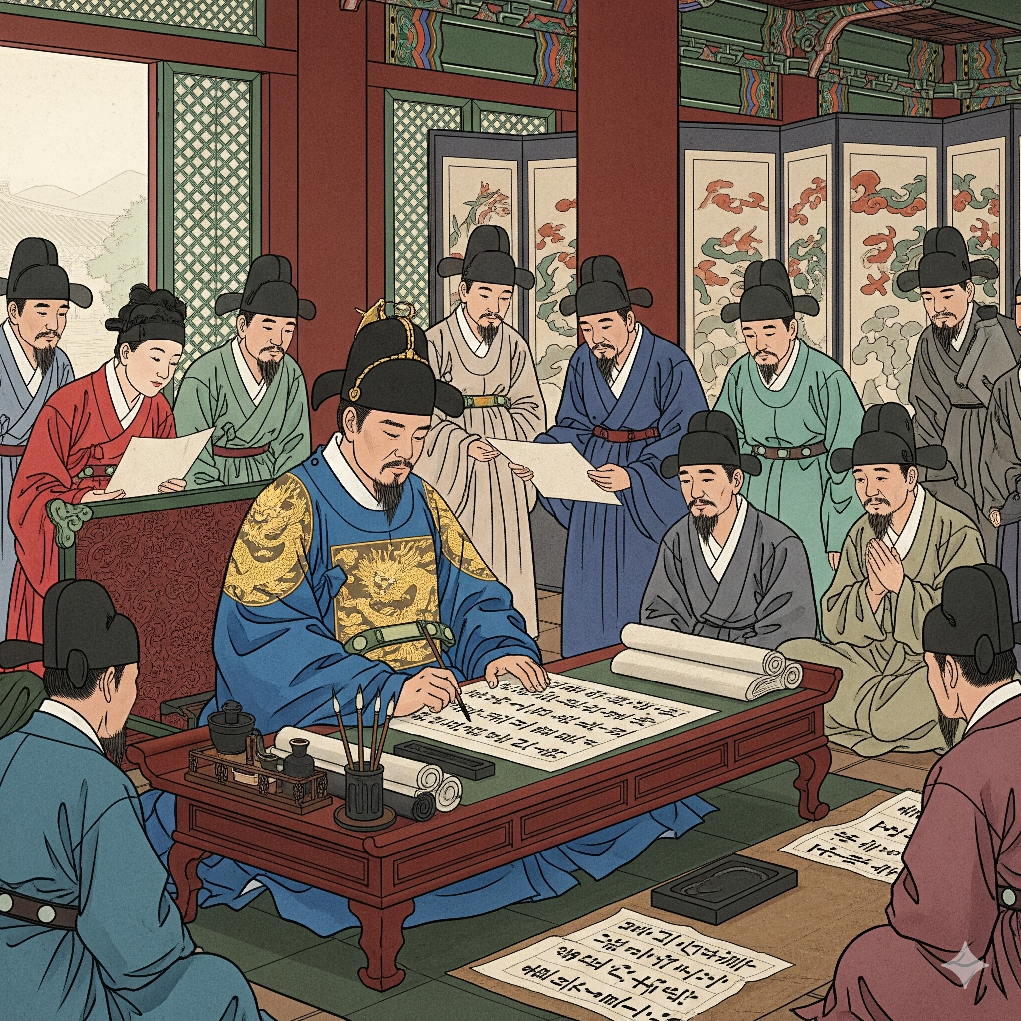 하지만 세종대왕은 백성을 향한 확고한 신념을 굽히지 않았습니다. 그는 밤낮으로 연구에 몰두하며, 정인지, 성삼문, 박팽년 등 젊고 재능 있는 집현전 학자들과 함께 비밀리에 훈민정음 창제 작업을 이어갔습니다. 그들은 단순히 소리를 흉내 내는 문자가 아닌, 발음 기관의 모양과 음양오행의 원리까지 담아낸 과학적인 체계를 완성했습니다. 이처럼 한글 창제는 단순한 언어학적 업적을 넘어, 수많은 반대를 무릅쓰고 백성들의 삶을 실질적으로 개선하고자 했던 지배층의 위대한 결단이었습니다.