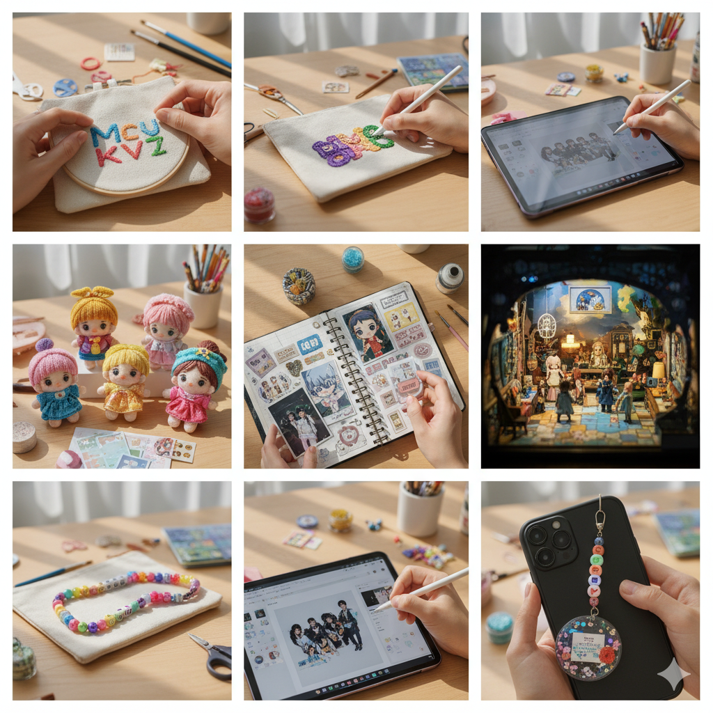 - 자수: 아이돌 로고, 캐릭터 얼굴, 혹은 작품 속 명대사를 수놓아 와펜, 손수건, #에코백커스텀 등에 활용해 보세요. 일상생활에서도 자연스럽게 덕심을 드러낼 수 있습니다.